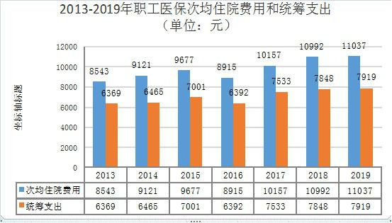 4.次均住院费用持续增长。2019年,全区职工次均住院费用为11037元,比上年增长0.41%。