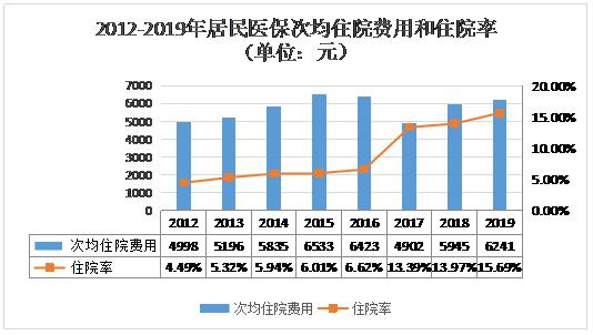 4.住院率和次均住院费用均上涨。居民医保参保人员住院率为15.69%,比上年提高1.72个百分点;次均住院天数8.5天,比上年提高0.4天;次均住院费用6241元,比上年增长5%。其中三级、二级、一级及以下医疗机构的次均住院费用分别为10446元、5736元、3208元,分别比上年增长11.65%、-1.63%、-0.31。
